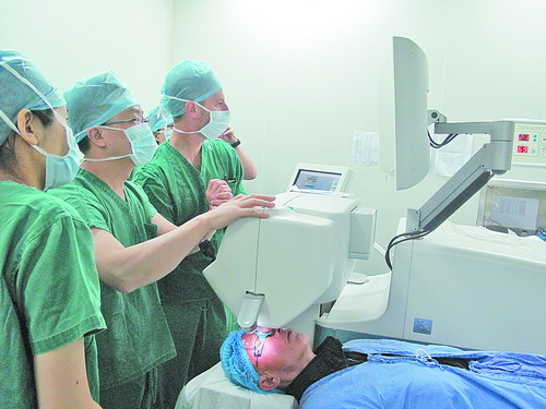 張廣斌主任(中)使用飛秒超乳設(shè)備為患者做白內(nèi)障手術(shù)