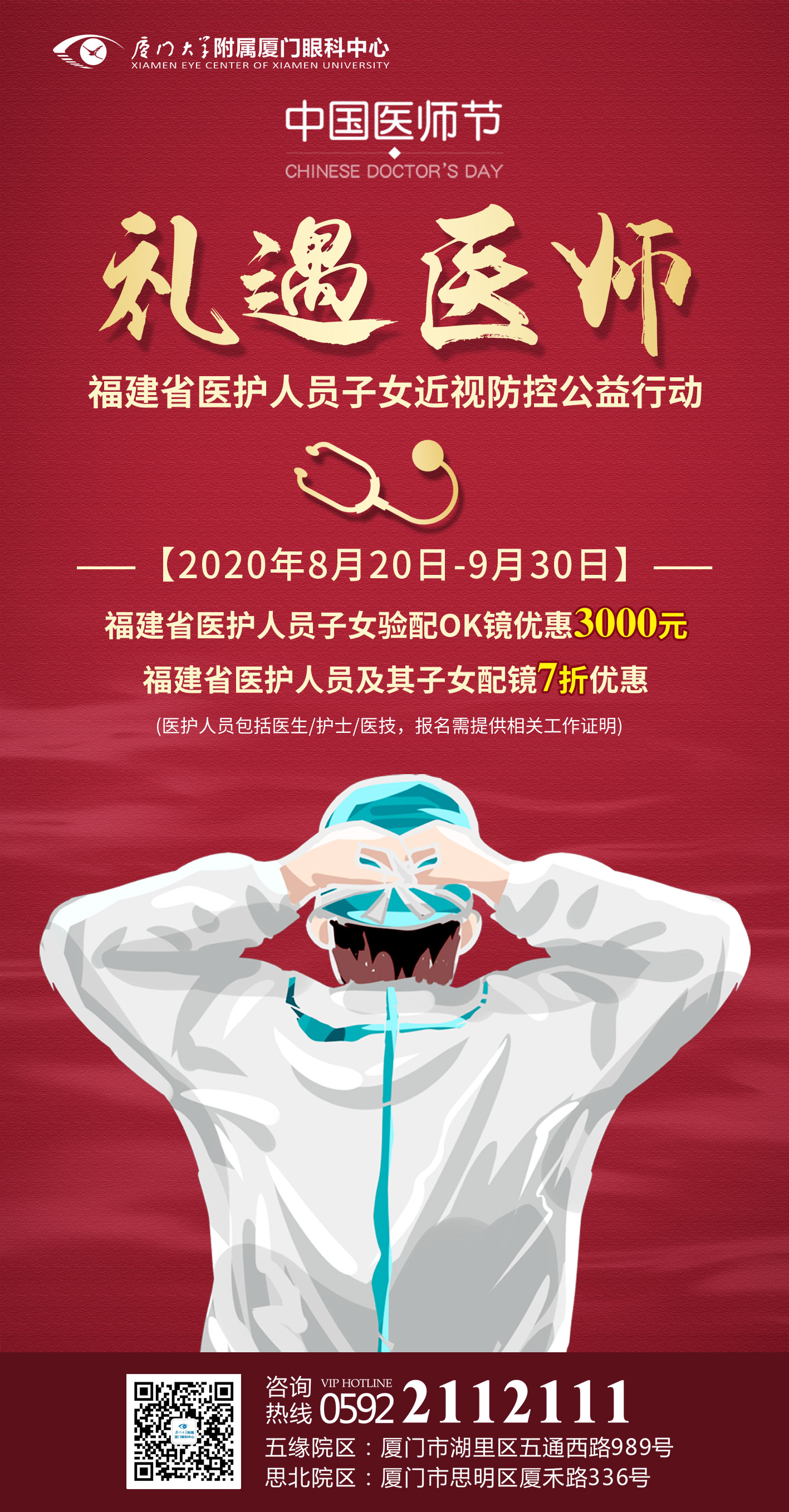 值此醫(yī)師節(jié)到來之際,廈門市衛(wèi)生健康委員會(huì)、廈門市醫(yī)師協(xié)會(huì)、廈門市衛(wèi)生健康委員會(huì)團(tuán)委聯(lián)合海西晨報(bào)發(fā)出“禮遇醫(yī)師”倡議。為響應(yīng)倡議,廈門大學(xué)附屬?gòu)B門眼科中心特舉辦福建省“禮遇醫(yī)師”醫(yī)護(hù)人員子女近視防控優(yōu)惠活動(dòng)。