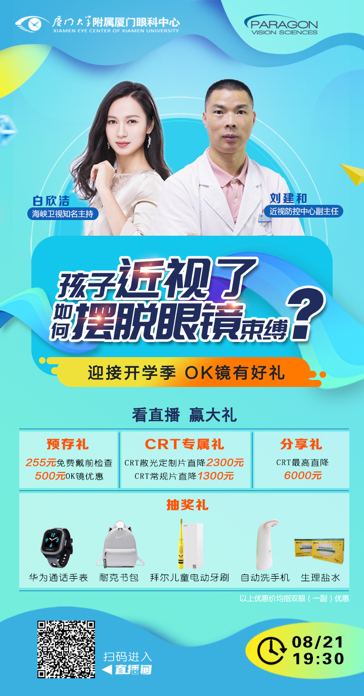 面對(duì)后疫情時(shí)代兒童青少年視力下降難題,廈門大學(xué)附屬廈門眼科中心將于8月21日推出“耀眼未來 非瞳凡響 ”兒童青少年近視防控ok鏡直播專場(chǎng)活動(dòng),全方面為您揭秘OK鏡,與您一同守護(hù)兒童眼健康。