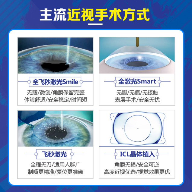 目前廈門大學(xué)附屬廈門眼科中心采用的近視手術(shù)主流方式有:ICL晶體植入術(shù)、全飛秒激光SMILE、全激光SMART及半飛秒激光。