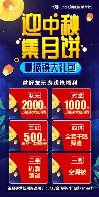 為了使更多的近視朋友輕松享受“無鏡”世界,廈門大學(xué)附屬廈門眼科中心于中秋國慶到來之際,特開展“迎中秋集月餅 贏摘鏡大禮包”的活動,讓近視的小伙伴可以獲得摘鏡優(yōu)惠和豐厚福利。