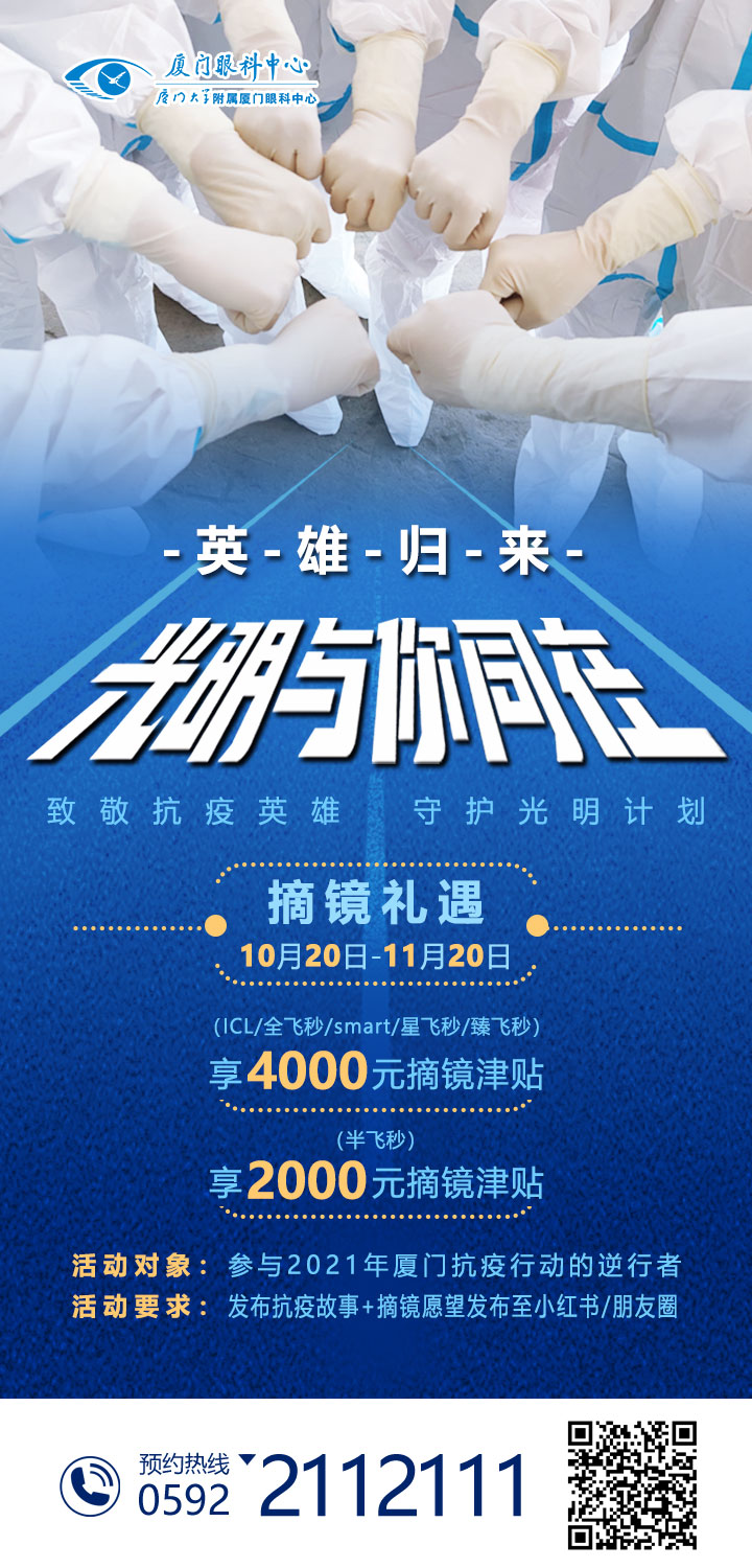 幸得有你,山河無恙。為表達(dá)對(duì)抗疫逆行者的崇高敬意,用愛回饋、致敬一線抗疫人員,廈門眼科中心將于10月20日—11月20日推出“致敬抗疫英雄 守護(hù)光明計(jì)劃”摘鏡優(yōu)惠活動(dòng)。