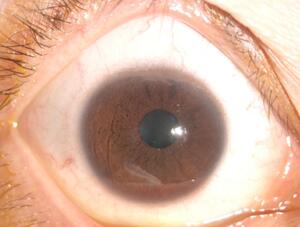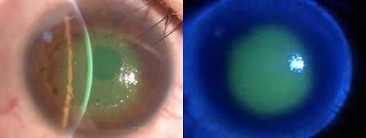 王女士回家后趕緊滴了眼藥水,未想第二天右眼疼痛更加明顯,已無法正常睜眼,視力也降到只有眼前手動。這下王女士慌了神,決定還是到正規(guī)??漆t(yī)院看病為好,經人介紹,王女士來到廈門眼科中心找到修陽暉博士就診。經過詳細的檢查后,修陽暉博士發(fā)現王女士患上了嚴重的角膜炎,中央區(qū)角膜已大部分受綠膿桿菌感染及浸潤。