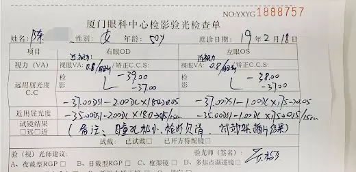 ▲陳女士的術(shù)前驗(yàn)光單