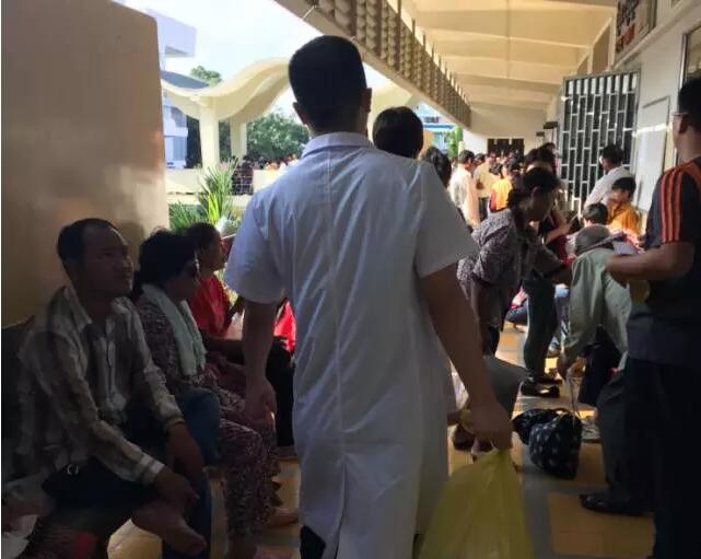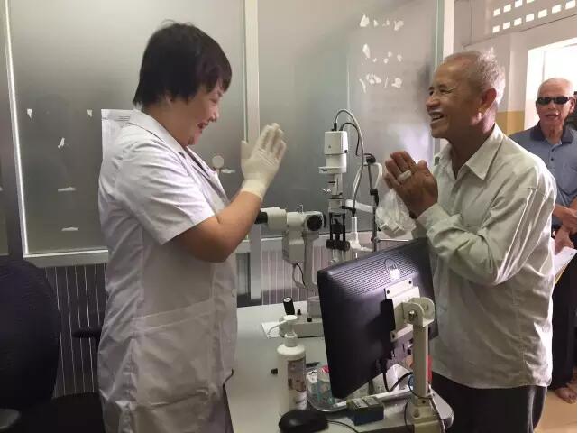 這個(gè)情況被手術(shù)結(jié)束出來取晶體的護(hù)士看到了,她報(bào)告給了醫(yī)療隊(duì)隊(duì)長(zhǎng)李立梅博士,李博士聽到后立刻走出手術(shù)室來到老人身旁,握起老人的手親切問到:“奶奶,你怎么了?是哪里不舒服嗎?”老人用弱小地聲音結(jié)結(jié)巴巴地回答了一堆柬語,經(jīng)過翻譯翻譯后才知道,老人是因?yàn)楹ε率中g(shù)心里緊張,再加上手術(shù)室的冷氣才發(fā)抖的。
