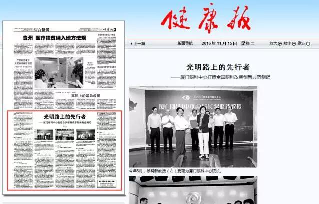 11月15日,由國家衛(wèi)生計生委醫(yī)政醫(yī)管局主辦,《健康報》社承辦的“改善醫(yī)療服務 我們在行動”欄目對廈門大學附屬廈門眼科中心的改革創(chuàng)新行為進行專題報道,高度肯定了廈門眼科中心一切以病人為中心,踐行供給側改革所取得的成績。