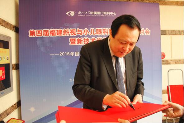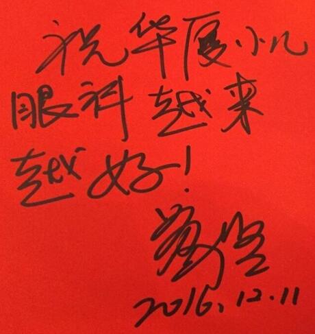 臺(tái)灣斜視與小兒眼科專家王藹侯教授就學(xué)齡前兒童的視覺篩查的經(jīng)驗(yàn)與展望作出演講,旨在讓小兒眼科醫(yī)生能通過(guò)篩查,及早發(fā)現(xiàn)和干預(yù)小兒眼病的發(fā)生,并為廈門眼科中心題詞“小兒眼科臨床工作日益精進(jìn),篩查工作、衛(wèi)教工作日益普及”以此勉勵(lì)。