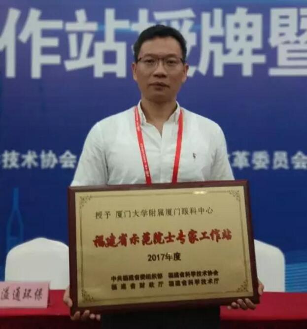 眼科醫(yī)院集團(tuán)副總裁李曉峰作為代表上臺(tái)領(lǐng)獎(jiǎng),捧回了“福建省示范院士專家工作站”獎(jiǎng)牌。