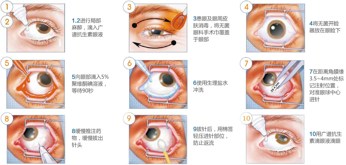 眼內(nèi)注藥是從白眼球進針,將藥物注射至眼球內(nèi)。表面麻醉即可,注射過程數(shù)秒鐘,痛感不明顯,不必擔(dān)心。