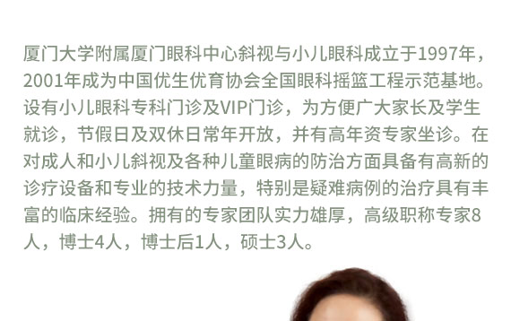 中國優(yōu)生優(yōu)育協(xié)會廈門眼科搖籃示范基地負責人,《中國斜視與小兒眼科雜志》編委,長期從事斜弱視、小兒眼科專業(yè)的臨床及應用研究工作,兼任廈門大學醫(yī)學院及廈門醫(yī)學高等專科學校教學工作,對成人及兒童各種類型的斜視,包括特殊類型斜視、復雜性斜視的手術治療;低齡兒視功能發(fā)育性疾病的篩查及治療;兒童、青少年屈光不正、弱視治療等方面有著深入的臨床研究和豐富的經(jīng)驗積累。先后主持和參與福建省、廈門市科科研課題立項6項,《斜視診斷詳解》、《角膜膠原交聯(lián)技術及臨床應用》專著編委,近期在國家級及省級學術刊物發(fā)表專業(yè)論文20余篇,曾先后赴美國、法國、新加坡、日本等國家進行參觀學習和國際眼科學術交流。