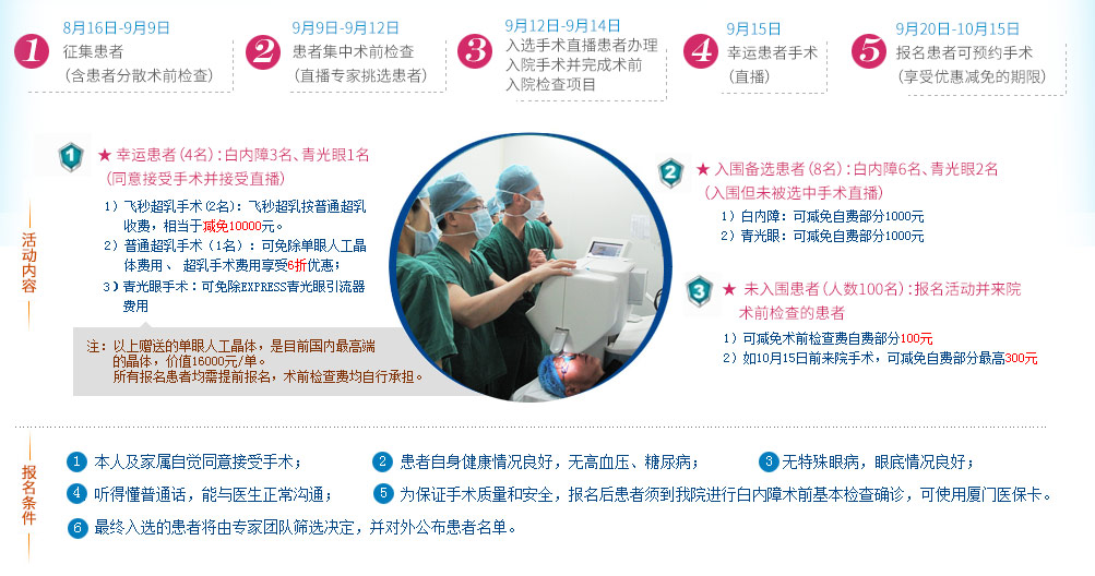 屆時受邀的國內專家會在現場“傳道解惑”探討當今眼科技術。研討會期間廈門大學附屬廈門眼科中心將面向社會大眾開放,全國眼病患者可先提前報名預約專家會診,屆時將有機會獲得免費手術名額。幸運獲獎者可讓國內眼科專家為其免費手術,我院還將進行實況手術直播,與國際眼科專家共同交流經驗。