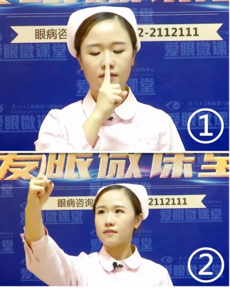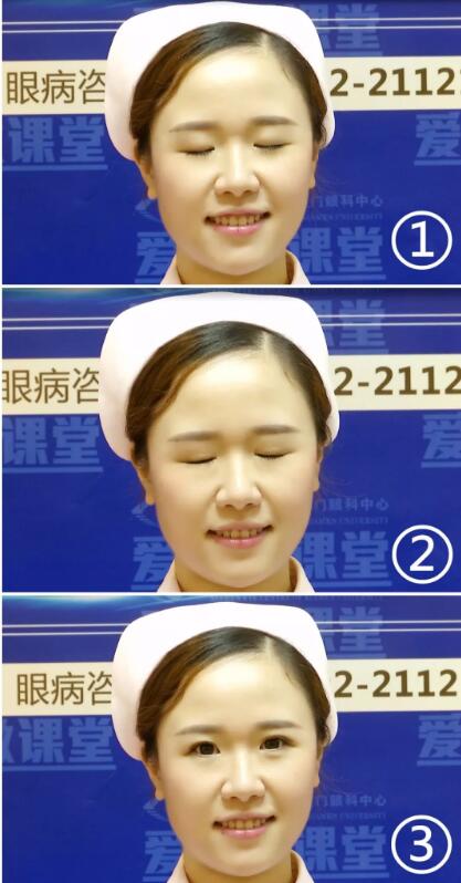 接著呢,我們輕輕閉上雙眼三秒鐘;再用力閉緊雙眼三秒鐘;最后用力睜開雙眼三秒鐘。整套動作,一共9秒鐘,我們總共要做4次~