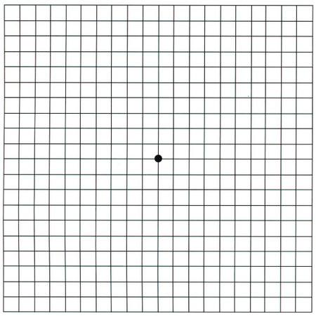 有一種簡(jiǎn)單且能夠及早發(fā)現(xiàn)老年性黃斑變性的方法,叫做阿姆斯勒方格(如下圖)。這是一個(gè)打印的正方形的小格子,類似于棋盤(pán)格,尺寸一般是15厘米X15厘米?;颊呖梢园阉N在冰箱上,每隔一周擋住一側(cè)眼睛看一看,如果發(fā)現(xiàn)自己任何一側(cè)的眼睛看到格子變形了,就需要來(lái)看醫(yī)生了。