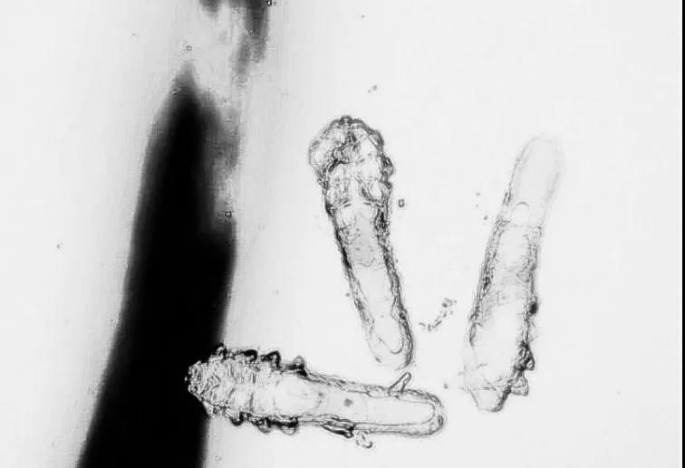 顯微鏡下附在睫毛上的蠕形螨